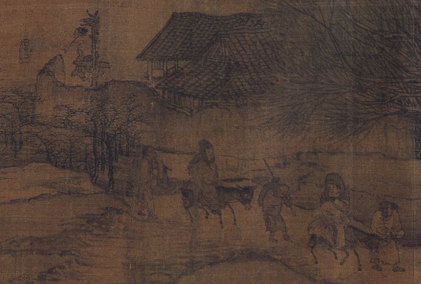 Annotation: "Here we can see, in the rural outskirts of the city depicted in the Qingming scroll, two women riding what..." |