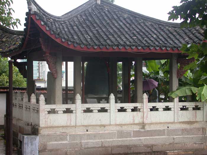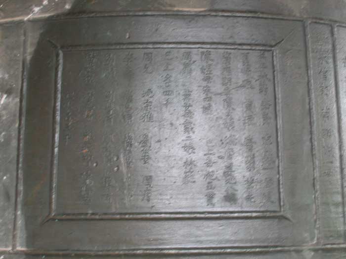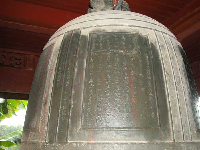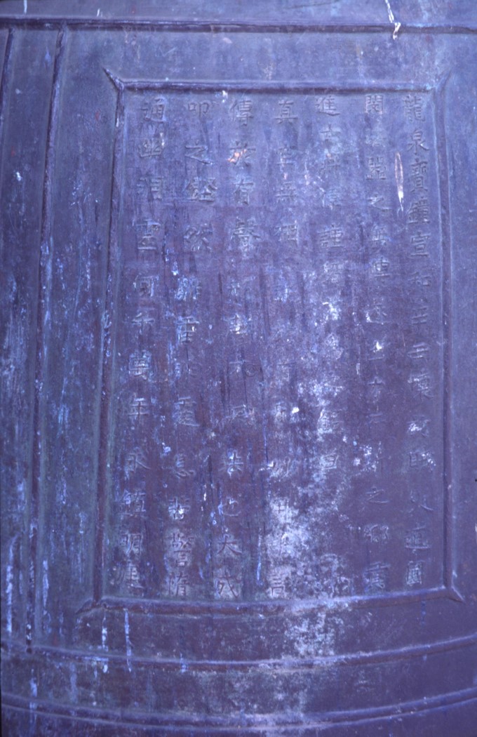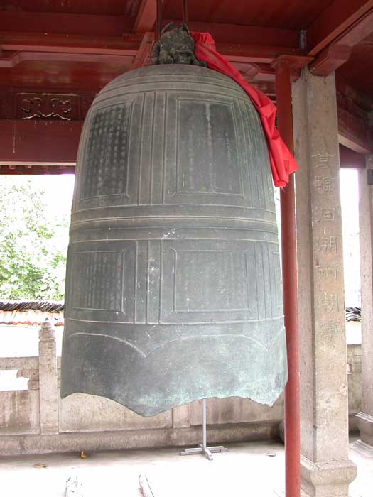 In 1998 the bell was sitting outside the Great Hall; the pavilion was built later. The story of its creation is told on panels that were cast into the bell itself. Panel 1Jianyan 2 [=1128], the shushen year, 2nd month, 24th dayWe respectfully wish long life to the current Emperor. May good fortune extend to the prefectural and county officials, the armies, and all the people. Erected by the former abbot and general administrator, Monk Daoyuan The treasured bell of Longquan was destroyed by rebel arson in the xinchou year [=1121]. Daoyuan Minfa mourned that it would not be passed on, he thereupon put forth his own means to restore it. The local degree candidate Jiang Jin reverently offers this inscription for it. “Truly empty and without image, it makes use of what has form. Subtle functioning that is difficult to describe, it is transmitted by what has sound. Form and sound are not destroyed; the dharma is realized. Ring it and it sounds true; neither thunder nor clap, it relieves the distressed and warns the indolent. It penetrates the mysterious, it accesses the divine power. Not only for a thousand or a myriad years, may it eternally secure this radiant courtyard.” Female disciple 6th Sister Liu and the wife of the male Chen Hao 16th Sister Xia donate 30 strings. Female disciple 3rd Sister Liu and the male Xia Tanlang donate 30 strings. Female disciple 3rd Sister Chen and the wives of the males Wang Tong and Wang Xian, 21st Sister Pan and 4th Sister Xia, donate 30 strings. Female disciple 8th Sister Yao and the wife of the male Chen Lin 19th Sister Liu donate 15 strings. Disciple Xia Boying, his wife 8th Sister Wang, and the wife of the male Gao 18th Sister Dan donate 15 strings. Zhang Sheng’s wife 2nd Sister Zhou donates 15 strings. Yan Guangyi, the wife of Pan Sinian 7th Sister Ye, wife of Ye Wei 11th Sister Zheng, mother of Liu Shihua 3rd Sister Xu, and wife of Su Side 4th Sister Zhou each donate ten strings. (most of the panels are records of contributions to the temple to cast the bell). In the gengshen year [=1080], 1st month, 24th day, the former abbot Changyu had donated 500,000 for casting. In the xinchou year [1121] it was destroyed in the fires of war. It was recast after collecting extra material and once more asking for the help of believers. Desiring merit we offer this to the master and administrator of Changyu Hall, the monk Xitan. |
