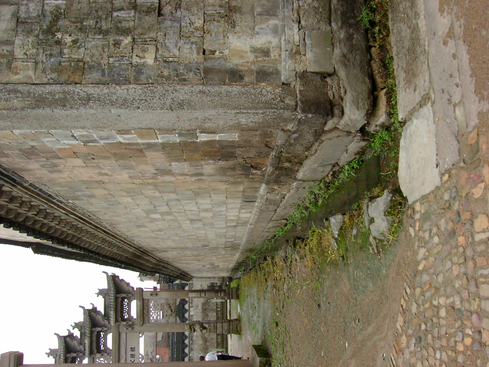 Front detailed shot of water ditch reveals construction of old building. |