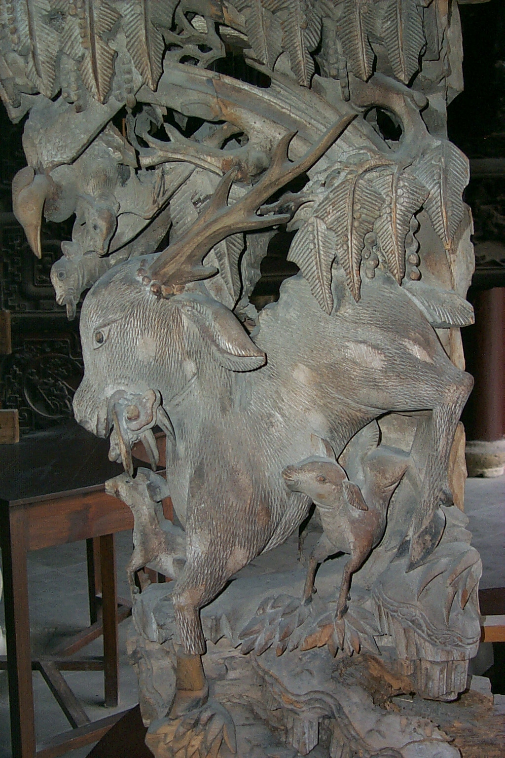 The middle part of the wooden carving. 'Deer' and 'prosperity' are homophone in Chinese, therefore deers are regarded as auspicious animals by Chinese. |