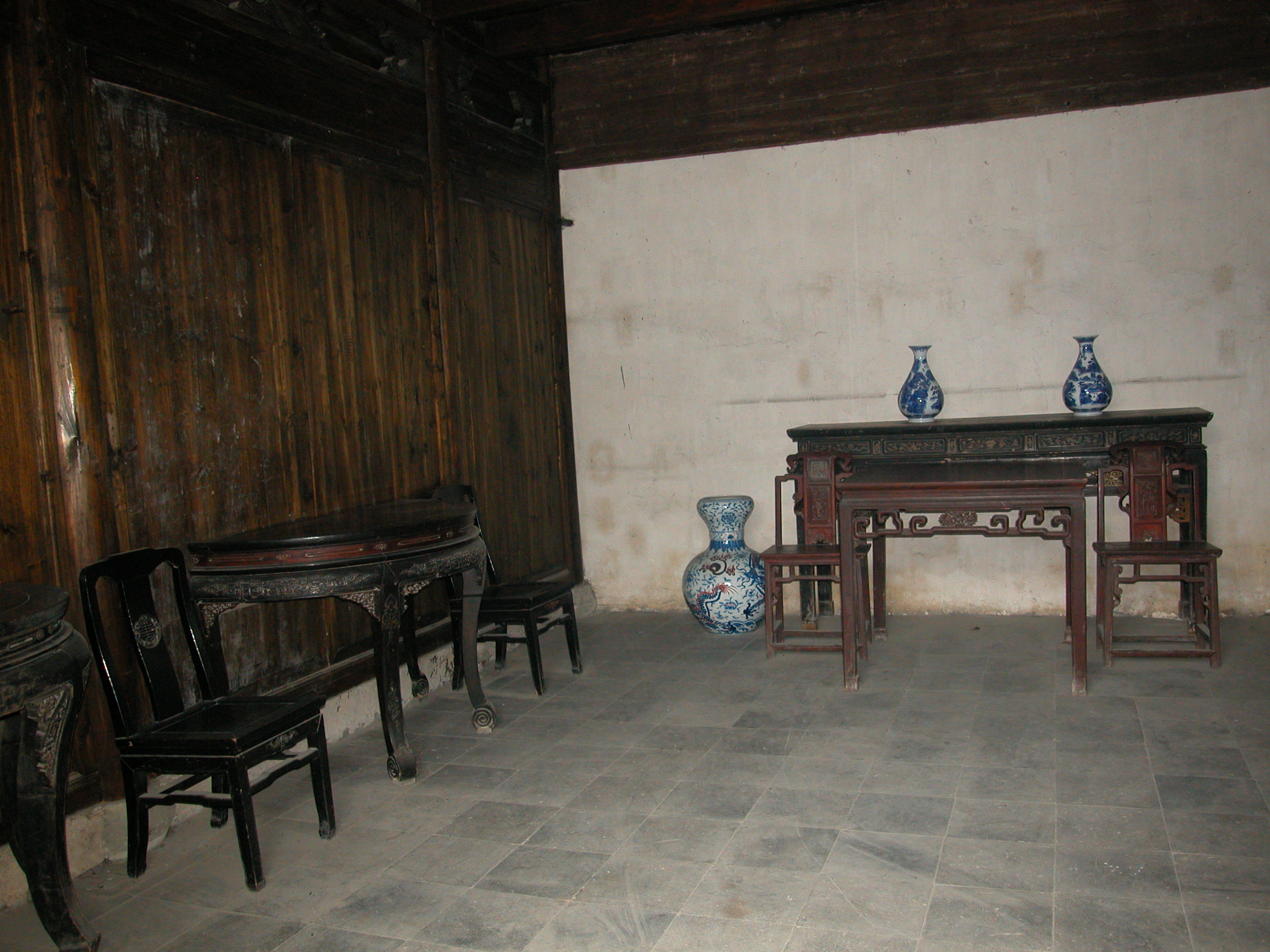 Left side house inside next to the Shude yard A large vase and 2 small vases, tables and chairs |