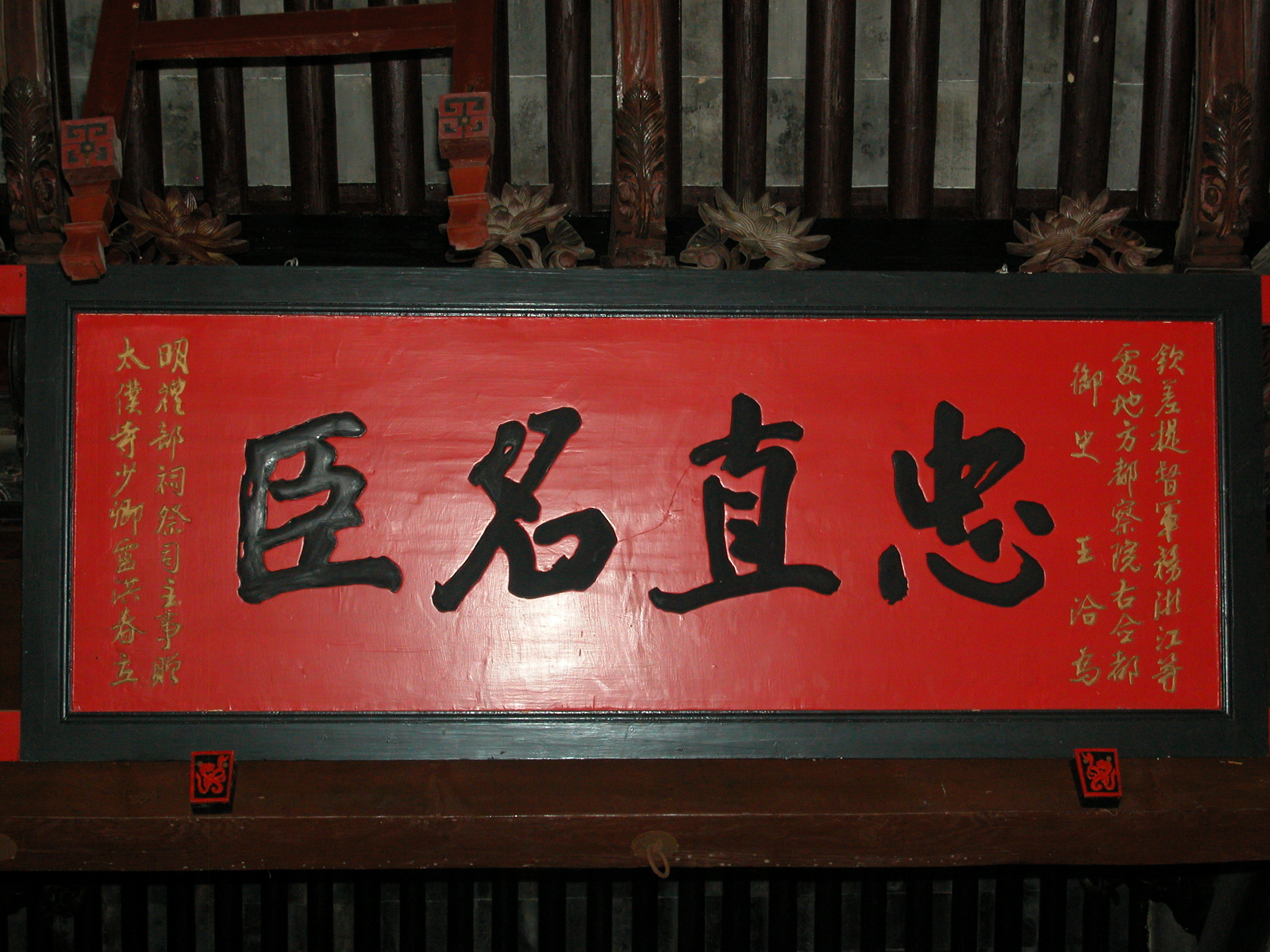 The plaque 'The loyal and upright renowned official' for Lu Hongchun, Secretary of the Sacrifice Office of the Ministry of Rituals, granted the title of Vice Minister of the Court of the Imperial Stud, by Wang Qia, the Assistant Censor-in-chief of Zhejiang Regional Censorate. Date unknown. |