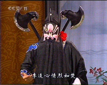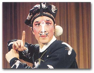 “The ch’ou is the clown or comic of the Chinese stage. He is not necessarily a fool and may portray a serious or evil character as against a merely ribald one. … He is at liberty to improvise as the mood strikes him, the spontaneous quip and local jest are both a part of his technique and he takes the audience into his confidence with a bat of the eyelids or a knowing leer. In all his interpretations there is combined the skill of the mimic and the acrobat. His make-up is always characterized by a white patch round the eyes and nose, Sometimes various markings in black are superimposed. The main role divided into two styles, wen ch’ou and wu ch’ou. The former may be a character such as a woodcutter, a jailer, a watchman or a servant, while the latter is an armed character such as a minor military official who performs the acrobatics connected with fighting and horse riding.” (A. C. Scott, The Classsical Theatre of China, New York: The Macmillan Company, 1957, pp.76-77)